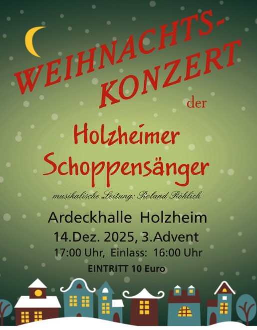 Am 14.12.2025 (3. Advent) um 17 Uhr dann das traditionelle Weihnachtskonzert. Die Schoppensänger werden die Ardeckhalle in ein stimmungsvolles Weihnachtsdorf verwandeln und